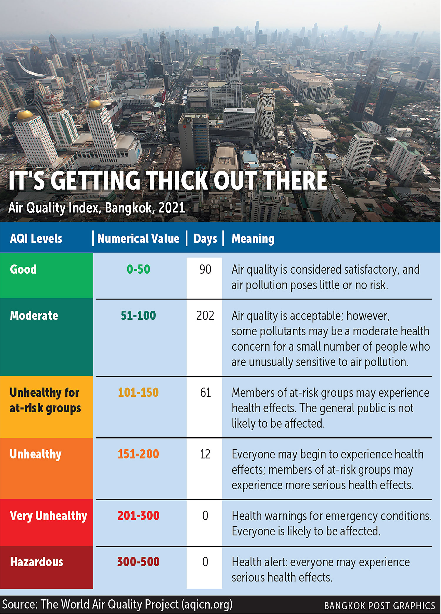 Figures on Bangkok air quality by the World Air Quality Index Project, cited in a Rocket Media Lab report, said Bangkok enjoyed only 90 days of "green" air quality last year, or 24.6% of the entire year.