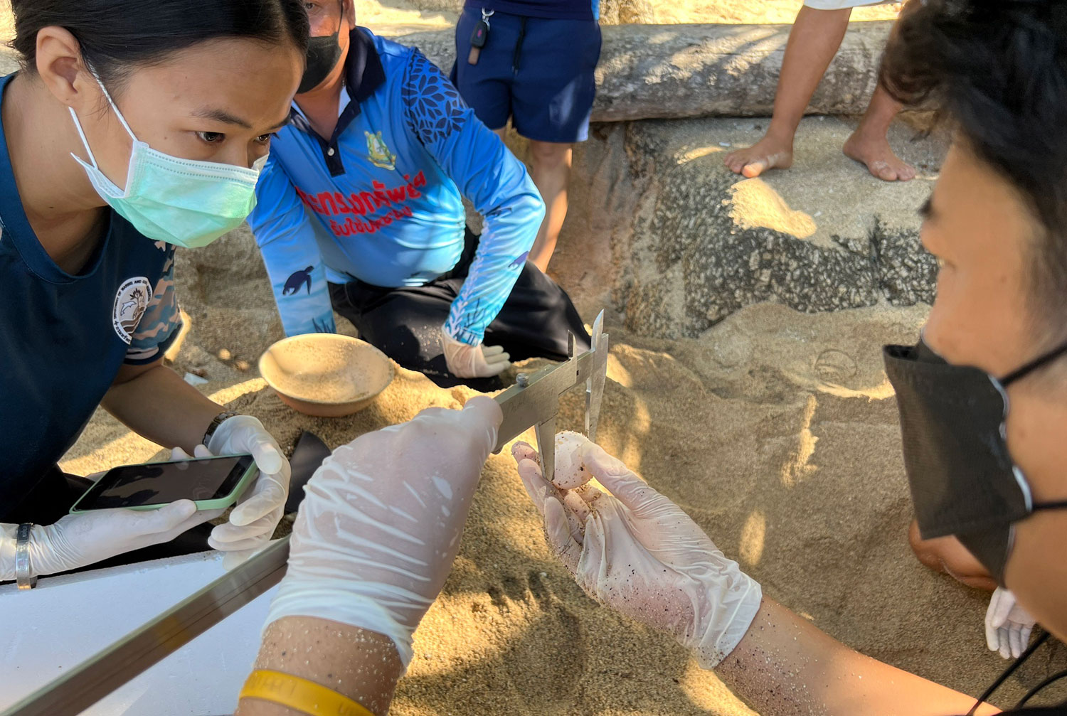 Officials examine sea turtle eggs on Ao Sane beach in Phuket on Saturday morning. (Photo supplied: Achadthaya Chuenniran)