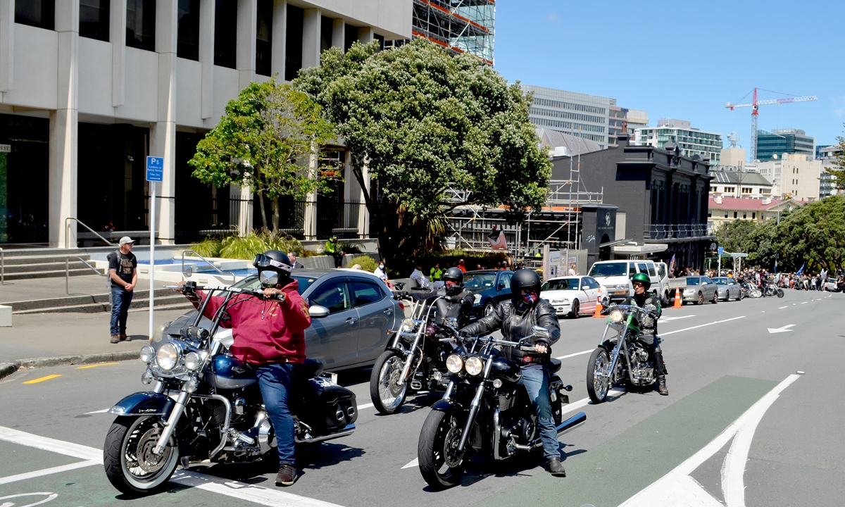 Bike riders gather for a Freedom and Rights Coalition demonstration to demand an end to COVID-19 restrictions and mandatory vaccination outside the Parliament House building in Wellington, New Zealand on Tuesday. Photo: AFP